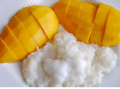 Sticky rice cooked in sweetened coconut milk. Served with ripe mango. Seasonal.